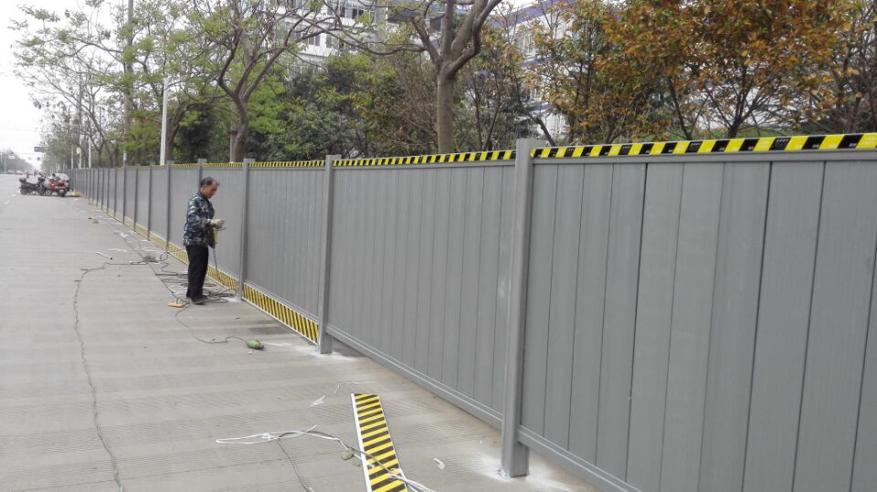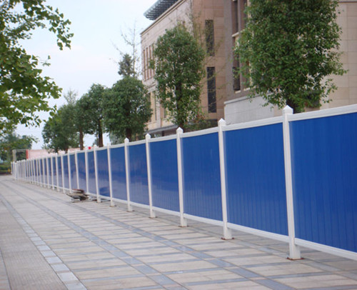 产品名称:PVC围挡 产品材质:PVC 产品颜色:蓝色、灰色、可定制 产品特点: 1、结构稳定 2、受力破坏时延伸性好 3、可多次周转重复使用,摊销成本低 4、环保节能 5、运输轻便,使用方便 6、可修复性好,易于更换和维修 7、防火,美观,安全性高 8、抗震性好 产品用途:一般适用于房屋建设,道路工程建设和市政建设。 围档护栏安装说明 1、围档护栏安装前通常是土建已形成交付砖砌或砼浇捣的下部基础,护栏可采用机械式胀栓、化学螺检等方式将立柱钢衬底板固定在下部基础的中心部位作直线均布。 2、如围档的下部基础尚未形成,建议将立柱钢衬增加长度直接预埋在墙体内,待墙体养护期后即可正式施工;或预制预埋件敷设在墙体平面以后将立柱钢衬用电焊方式与预埋 件焊接,这二种方式特点是较螺栓连接更为牢固,但预设时必须注意直线与水平线。 3、立柱钢衬的间距须与设计尺寸一致,保证预装配的半成品能与之连接。 4、在直线距离全段拉上下限二道平行线作安装调整基准。保证护栏安装竣工后上下端的平直度。 5、护栏的横、坚向钢衬均已在出厂前装设连接完成,各承重点的加强配件也已安装到位,现场施工时仅需将护栏横衬与立柱连接固定即可。